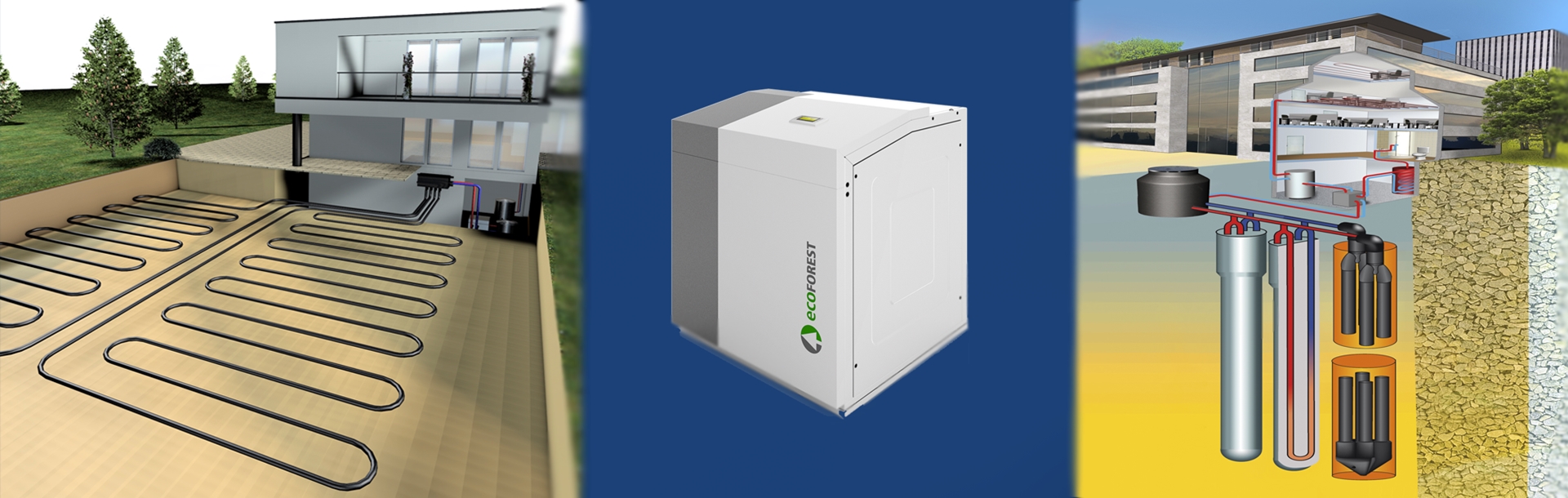 Combination of heat pumps with underfloor heating and cooling solutions as well as heat recovery solutions for hotels and industries lead to maximum energy savings and optimum thermal comfort.